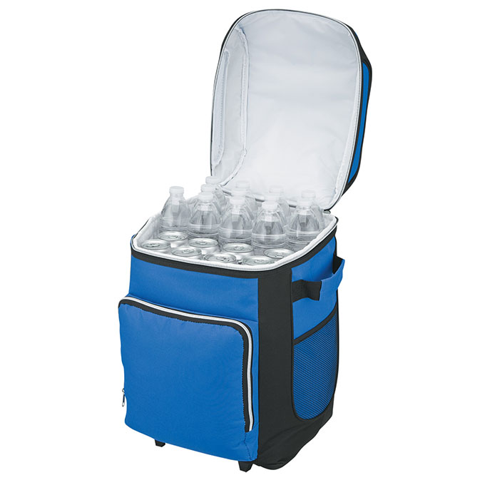 Capaciteit van deze trolley-rolkoeltas voor 48 blikjes of enkele wijnflessen en voedsel