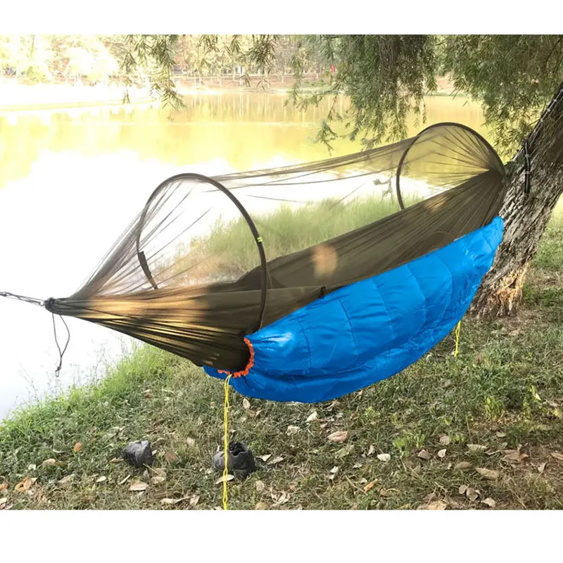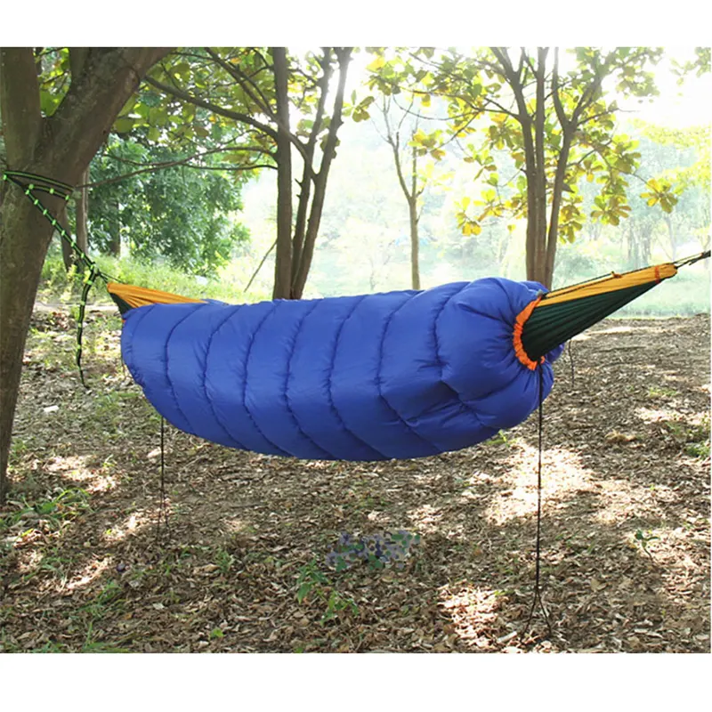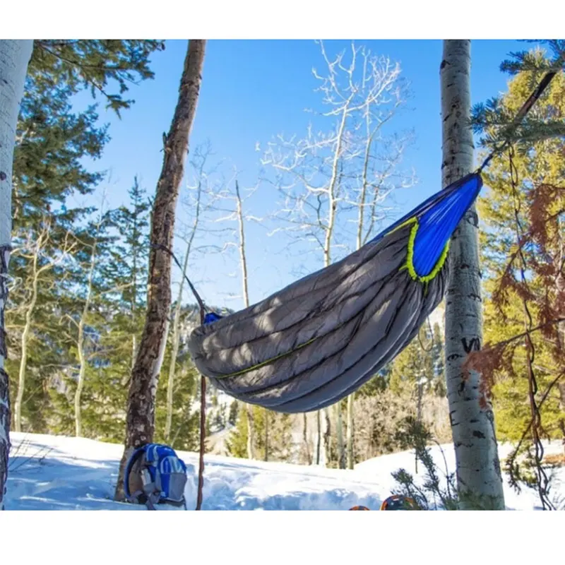 Lichtgewicht winterhangmat gemaakt van zachte ripstop gevuld met glad hol katoen, waardoor je warm en lekker warm blijft tijdens koude nachten, te gebruiken voor herfst en winter
